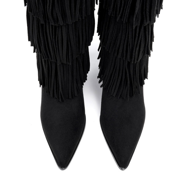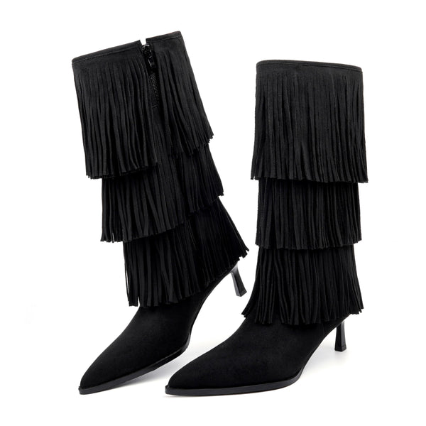 Vertundy Women's Fringe Boots Kitten Heel Pointed Toe Mid Calf Boots Tassels Design Fashion Suede Heeled Shoes